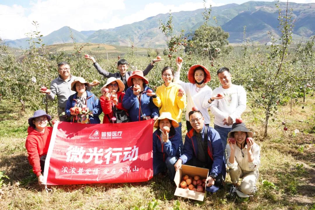 十月,正值鹽源蘋果收獲的季節,為了幫果農打開銷路,安心過冬,同時把新鮮采摘的鹽源蘋果回饋給普愛醫療的員工和會員俱樂部的會員們,公益團隊親自來到果園,幫助果農采摘蘋果。