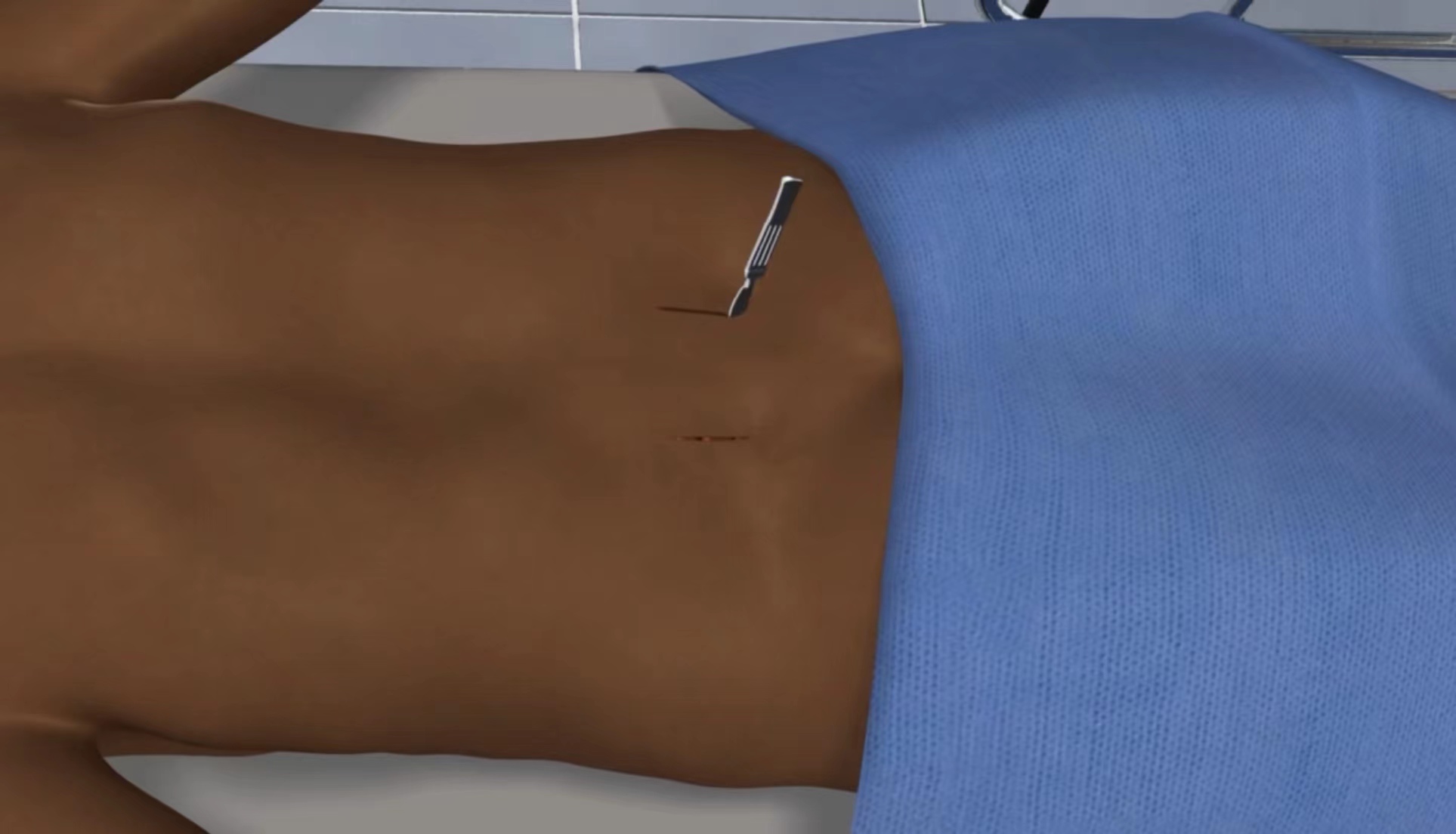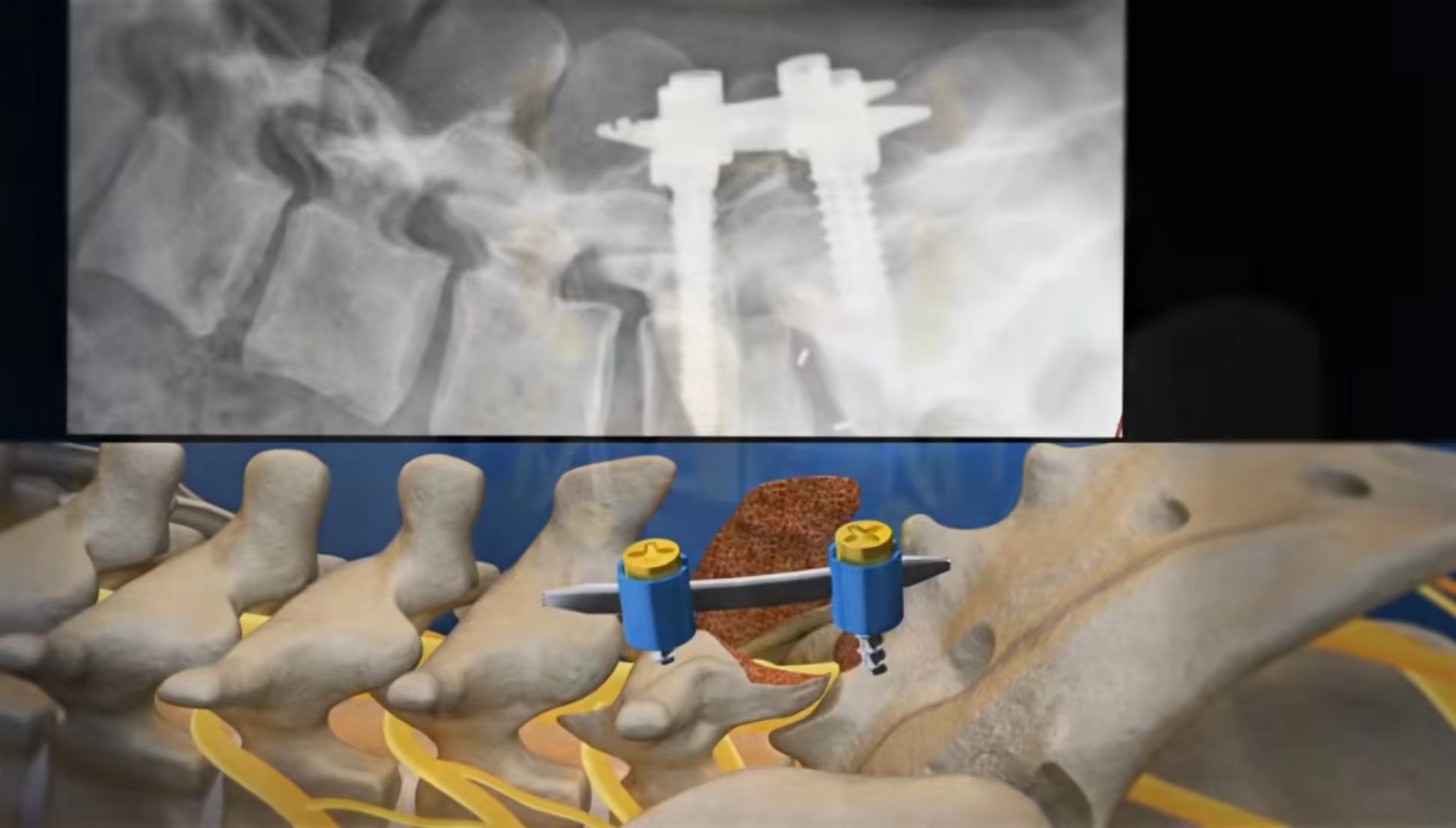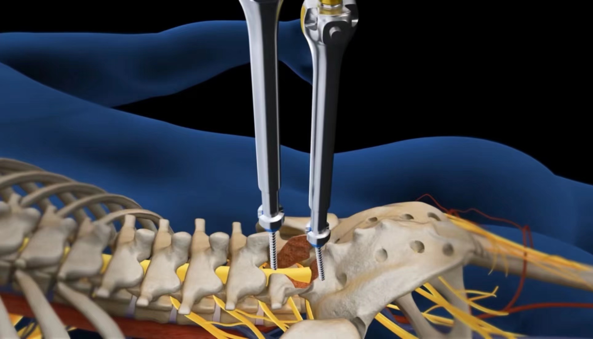 切口和術野顯露,在腰的后面作約8-10公分的切口。使用普愛大平板一體式C形臂來精確定位將要實施手術的脊柱部位。