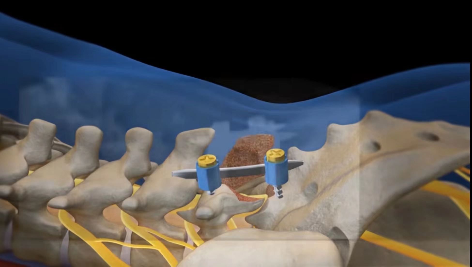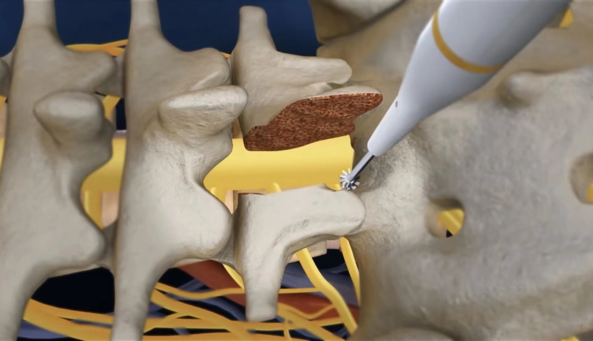 小心移除椎弓板(椎板),這樣才能夠看到和進入神經根部。可對神經根部上面的小關節進行修整,以讓出更多空間給神經根。外科醫生然后清除受累椎間盤及其周圍組織,并在相鄰椎骨表面為椎體融合做些準備。